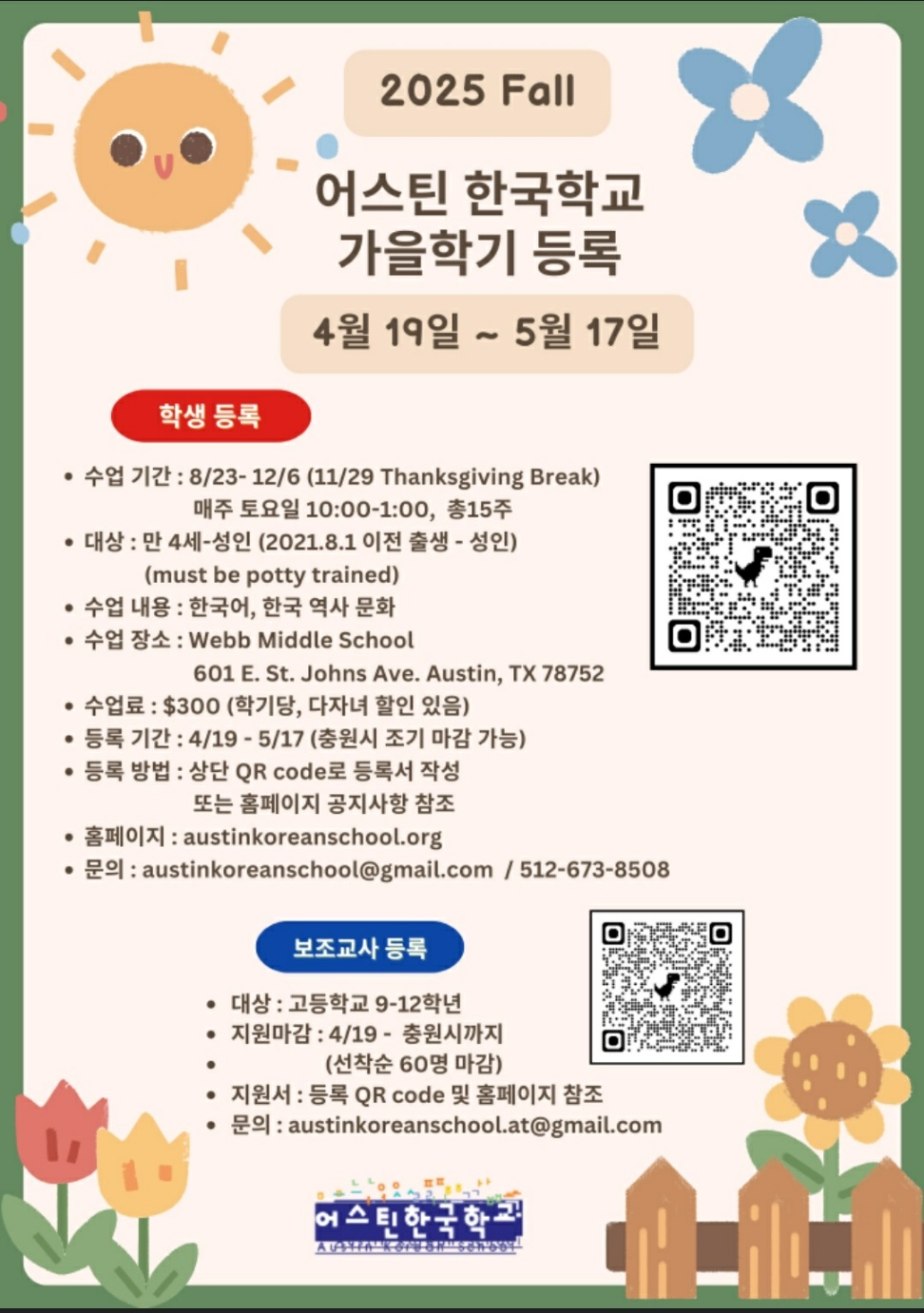 어스틴 한국학교 2025년 가을학기 등록 시작