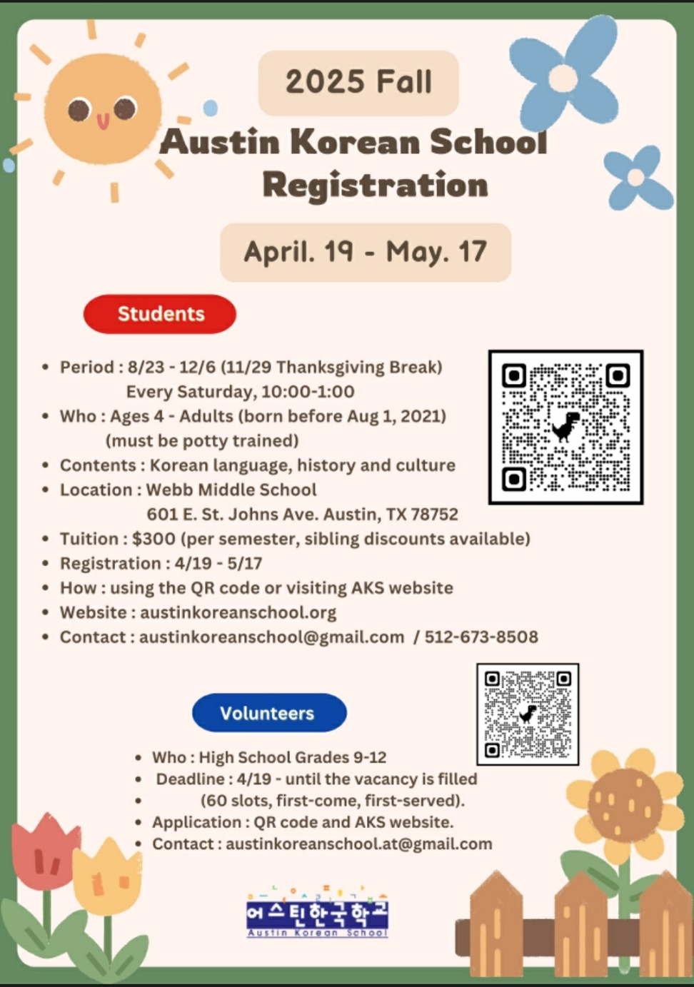 학교 홈페이지(austinkoreanschool.org)의 등록링크를 통해, 또는 한인마트에 게시될 포스터를(QR code) 통해 등록이 가능합니다.