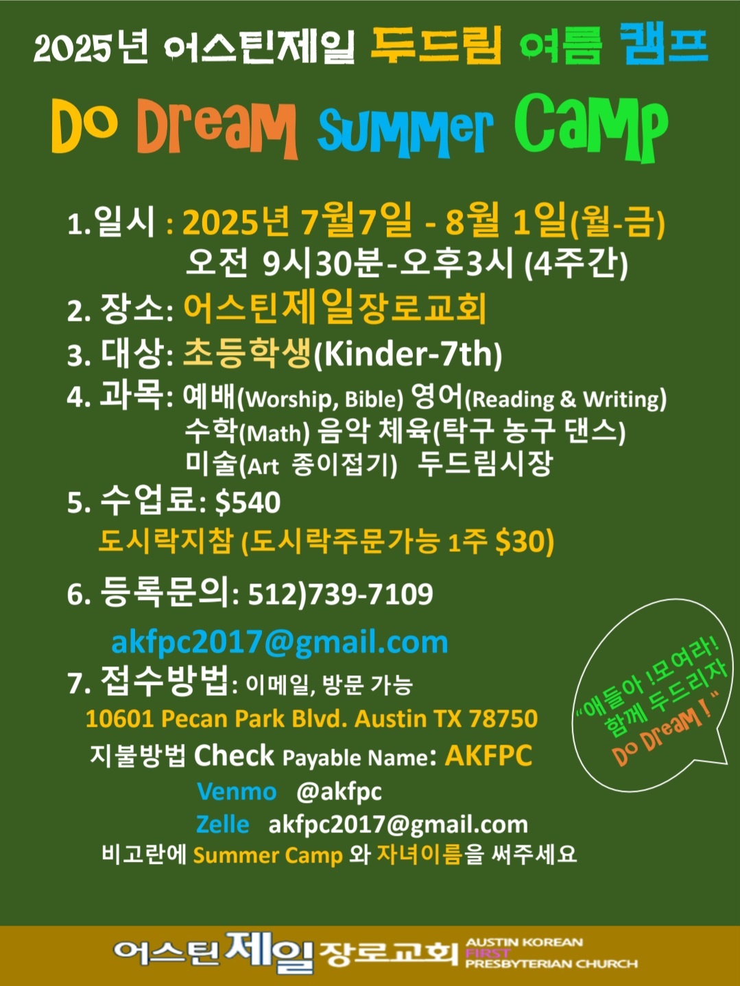 . 접수문의: 512-739-7109 / akfpc2017@gmail.com / 교회홈피참고 www.akfpc.org