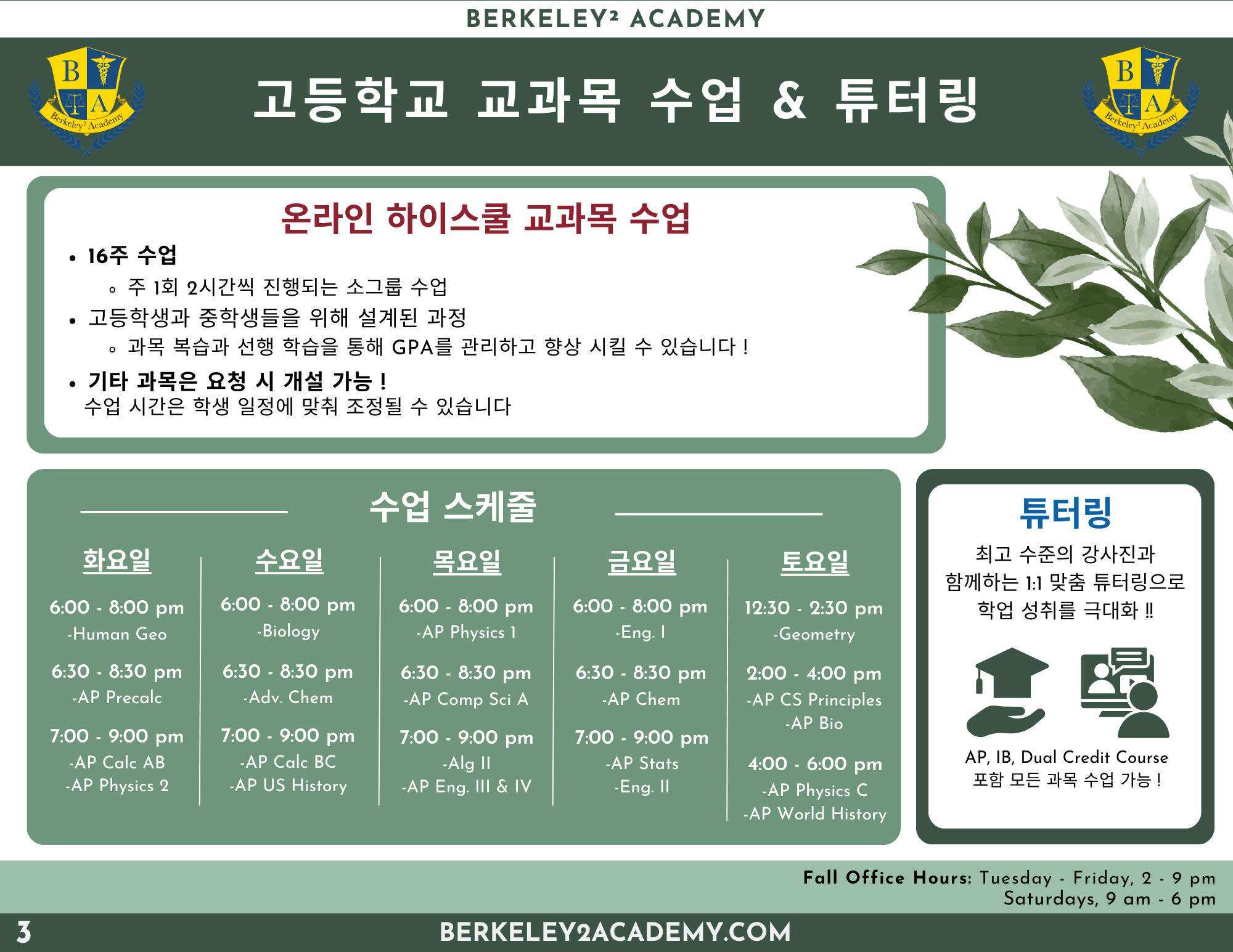 토요일 오전반 9:00am – 12:30pm