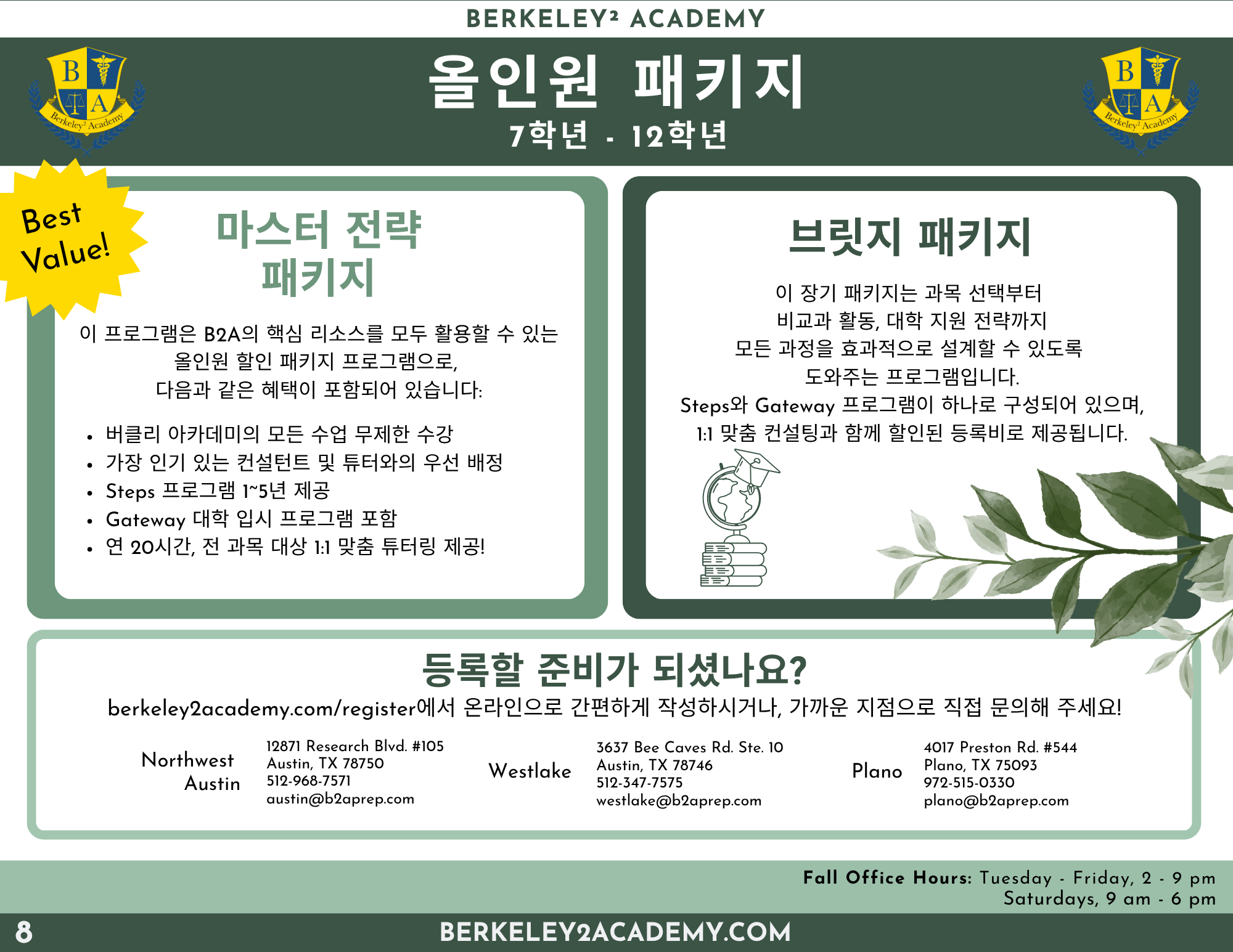 Westlake (Austin) 지점: 512-347-7575, westlake@b2aprep.