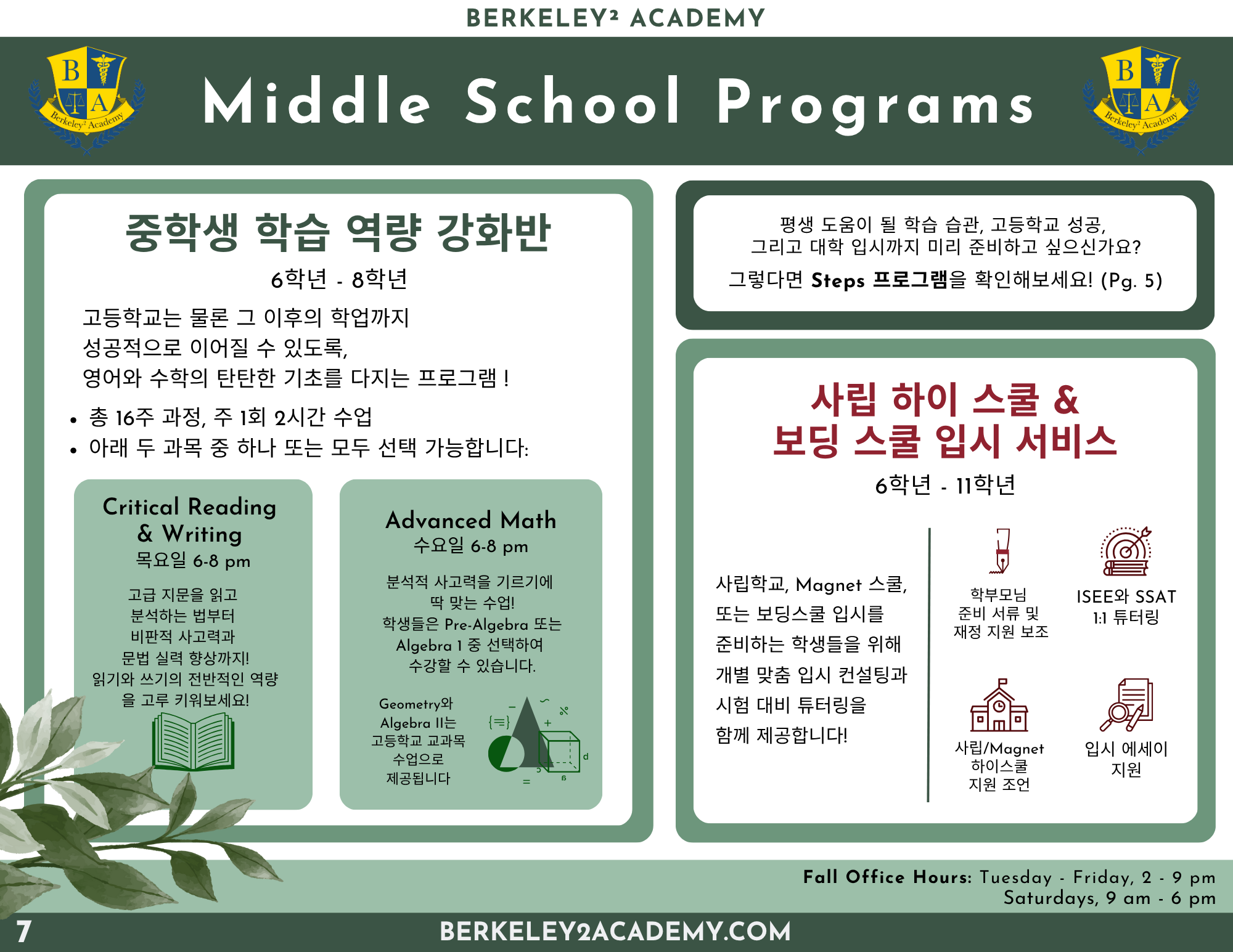 버클리 아카데미에서는 SAT/ACT 준비반, 고등학교 과목 보충 수업, 중학생 대상 기초 실력 향상반 등