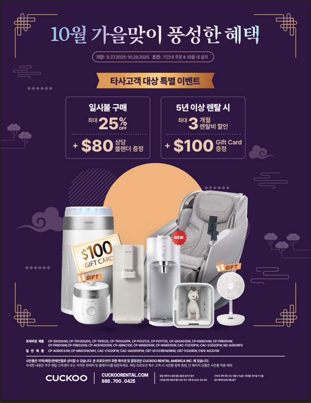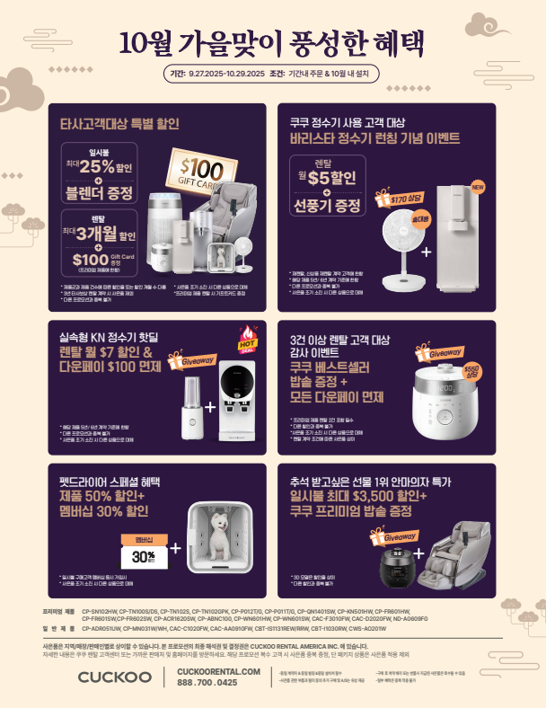 10월의 프로모션으로 안마의자를 파격적인 가격에 구입 및 렌트 하실 수 있습니다. (프로모션 : 일시불 3,500와 대여 시 다운페이 500불 오프와 월 렌트비 30불 할인)