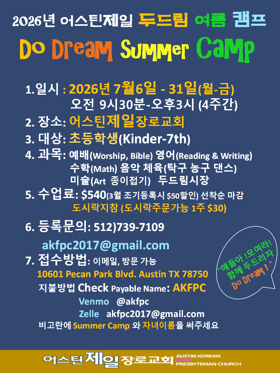 * 우편주소 : Austin Korean First Presbyterian Church / 10601 Pecan Park Blvd, Austin TX 78750