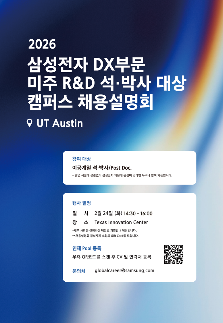삼성전자 DX부문에서 The University of Texas at Austin에 방문하여 이공계열 석사, 박사, Post-doc을 대상으로 채용설명회를 진행하고자 합니다.