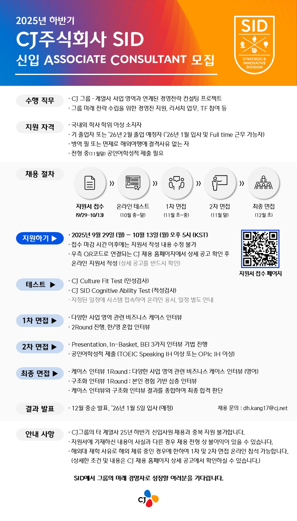 기업/기관 채용공고 25년 하반기 CJ주식회사 SID 신입 Associate Consultant 모집과 Q&A Session (10/10) Author KSA학생회 Date 2025-09-30 17:51 Views 314 - 25년 하반기 CJ SID 신입 모집공고 바로가기 ☞ Click - CJ주식회사 SID 홈페이지 둘러보기 ☞ cjsid.com Like 0 Unlike 0 Print Total 0 Best Oldest Newest You must be logged in to post a comment. « 2025 원익그룹 신입사원 공개채용 2025년 신입사원 및 외국어 우수 해외 주재원 공개채용 (~10/14(화), 23:59분) » List Total 1,081 Newest Best Viewed Updated Number Title Author Date Votes Views Notice ★★ 기업/기관 채용공고 게시판 이용안내 ★★(2023.10.1. 업데이트) KSA학생회 | 2023.10.01 | Votes 0 | Views 17809 KSA학생회 2023.10.01 0 17809 1049 연세대학교 미래캠퍼스 소프트웨어학부 2026학년도 1학기 전임교원 초빙 KSA학생회 | 2025.11.07 | Votes 0 | Views 150 KSA학생회 2025.11.07 0 150 1048 한화금융 2026 GIP 채용 KSA학생회 | 2025.10.27 | Votes 0 | Views 331 KSA학생회 2025.10.27 0 331 1047 [RISE] 2025년 하반기 졸업자 및 졸업 예정자 대상 채용 공고 KSA학생회 | 2025.10.27 | Votes 0 | Views 227 KSA학생회 2025.10.27 0 227 1046 한국전자기술연구원 정규직 공개채용 KSA학생회 | 2025.10.27 | Votes 0 | Views 221 KSA학생회 2025.10.27 0 221 1045 [JC Insurance Solutions] 생명보험·어뉴이티 전문 에이전트 모집 KSA학생회 | 2025.10.27 | Votes 0 | Views 172 KSA학생회 2025.10.27 0 172 1044 [JC Insurance Solutions] 영업지원팀 매니저 채용 KSA학생회 | 2025.10.27 | Votes 0 | Views 183 KSA학생회 2025.10.27 0 183 1043 [JC Insurance Solutions] 어드민 직원 채용 KSA학생회 | 2025.10.27 | Votes 0 | Views 161 KSA학생회 2025.10.27 0 161 1042 원익큐엔씨 미국법인 HR 및 GA 사원 채용 KSA학생회 | 2025.10.18 | Votes 0 | Views 297 KSA학생회 2025.10.18 0 297 1041 파수, 스패로우 2025년 3차 신입 공개 채용 KSA학생회 | 2025.10.18 | Votes 0 | Views 238 KSA학생회 2025.10.18 0 238 1040 LIG Nex1 2025 하반기 신학장학생 인재영입 KSA학생회 | 2025.10.18 | Votes 0 | Views 194 KSA학생회 2025.10.18 0 194 1039 25년 삼성금융사 해외 석박사 채용 KSA학생회 | 2025.10.12 | Votes 0 | Views 323 KSA학생회 2025.10.12 0 323 1038 2025 하반기 AMOREPACIFIC GROUP 신입사원 수시채용 (~10/19) KSA학생회 | 2025.10.08 | Votes 0 | Views 305 KSA학생회 2025.10.08 0 305 1037 현대자동차 10월 신입채용 KSA학생회 | 2025.10.01 | Votes 0 | Views 493 KSA학생회 2025.10.01 0 493 1036 2025년 신입사원 및 외국어 우수 해외 주재원 공개채용 (~10/14(화), 23:59분) KSA학생회 | 2025.09.30 | Votes 0 | Views 451 KSA학생회 2025.09.30 0 451 1035 25년 하반기 CJ주식회사 SID 신입 Associate Consultant 모집과 Q&A Session (10/10) KSA학생회 | 2025.09.30 | Votes 0 | Views 314 KSA학생회 2025.09.30 0 314 1034 2025 원익그룹 신입사원 공개채용 KSA학생회 | 2025.09.30 | Votes 0 | Views 389 KSA학생회 2025.09.30 0 389 1033 2025 Toss Ads ML Engineer 신입 집중 채용 KSA학생회 | 2025.09.30 | Votes 0 | Views 301 KSA학생회 2025.09.30 0 301 1032 [롯데케미칼 첨담소재사업] 2025년 Global Talent Recruitment (~10.12(일)) KSA학생회 | 2025.09.24 | Votes 0 | Views 356 KSA학생회 2025.09.24 0 356 1031 GIRE 리서치 교육 컨설턴트 모집 KSA학생회 | 2025.09.24 | Votes 0 | Views 278 KSA학생회 2025.09.24 0 278 1030 2025년 하반기 한화오션 대규모 신입사원 채용 (해외대 온라인 채용설명회) KSA학생회 | 2025.09.24 | Votes 0 | Views 408 KSA학생회 2025.09.24 0 408 12345678910»Last All Title Content Author Search Powered by KBoard